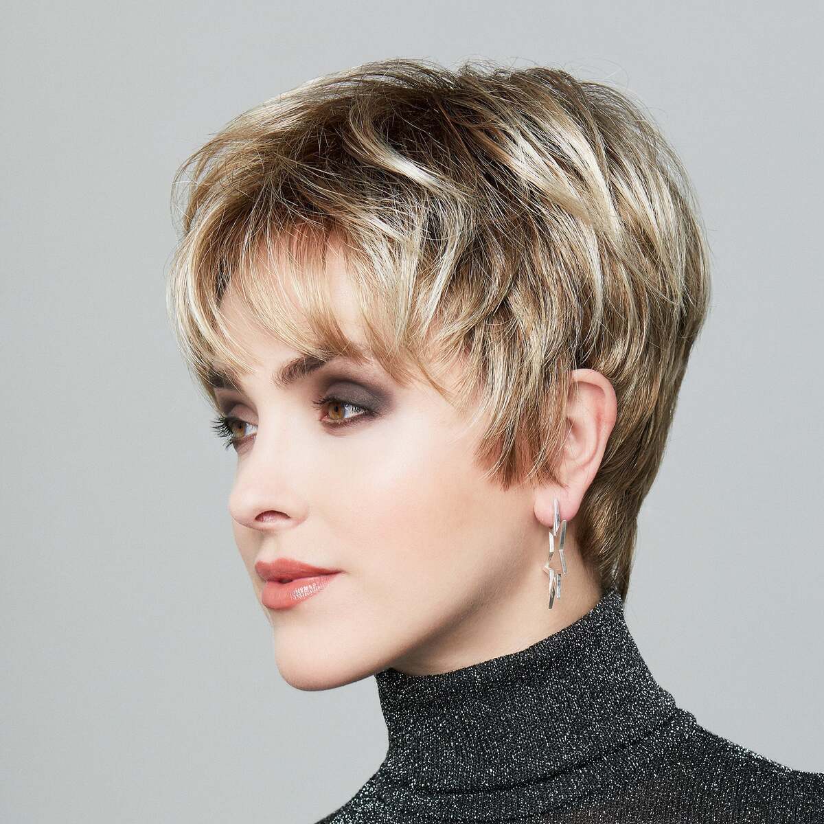 It is made of high-quality, well-tolerated synthetic hair that has been attached to the top of the head by hand on monofilament. The monofilament allows the parting to be pulled in any direction. The wavy hair is stylishly layered right down to the tips and runs down to the ears. The dark hairline ensures that the wig line is perfectly hidden, so that outsiders will not notice that you are wearing a wig. Discretion is therefore guaranteed here. The film line on the forehead provides additional concealment and makes forehead-free looks possible.
